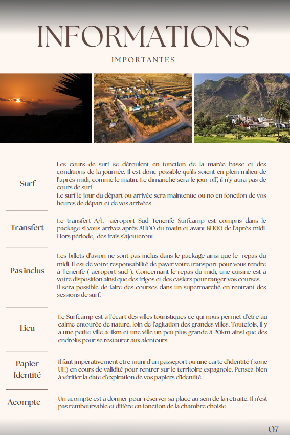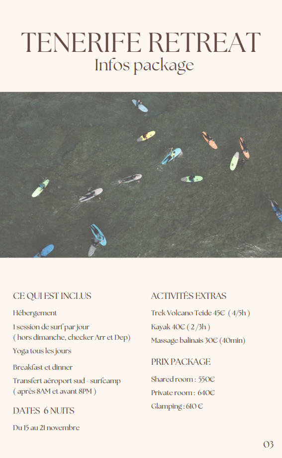 Venez vivre une aventure inoubliable qui allie relaxation, sport et découverte culturelle. Réservez dès maintenant votre place pour une immersion complète dans le bien-être et l’aventure au cœur de Tenerife.